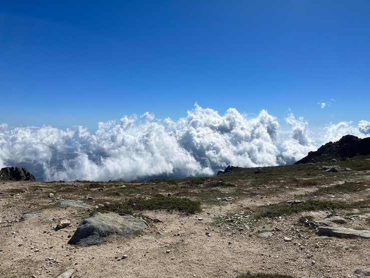 On pense toujours être arrivés en haut mais non, ça commence à bien tirer et ça fait longtemps qu’on a dépassé les statistiques prévues de la journée. Une fois vraiment en haut, un panorama magnifique et une belle mer de nuage se forment d’un côté.